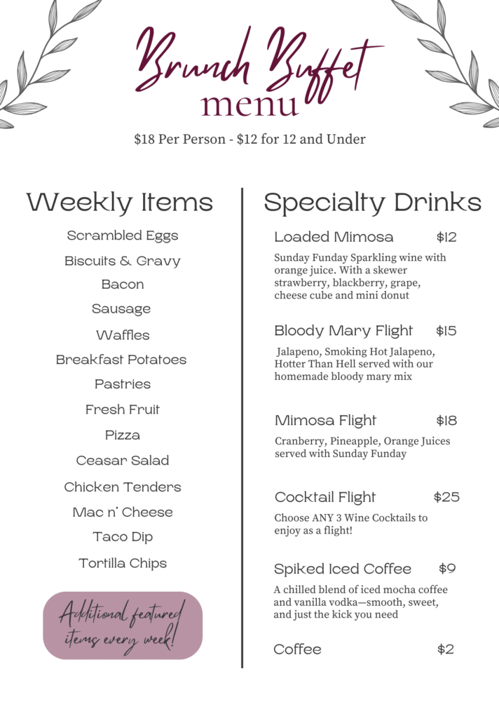 Our buffet features a rotating selection of brunch favorites alongside our signature mimosas, wine slushies, and more. See our menu below for more details!